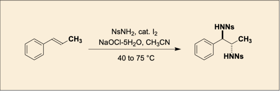 Abstract: In this study, we developed an environmentally friendly synthetic method that achieves the stereospecific anti-diamination of trans-β-methylstyrene with high selectivity and yield, utilizing an iodine catalyst and sodium hypochlorite pentahydrate.