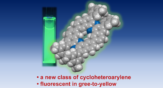 Abstract: A new class of cyclic π-extended heteroarylene oligomer─cyclic homodimer of U-shaped dibenzophenazinylene─has been successfully synthesized and characterized. NMR spectroscopy and DFT calculations implicated the unique topologies of the macrocycle. The cyclic dimer displays intense green-to-yellow fluorescence in both solution and the solid state. Remarkably, it shows acid-responsive color changes and a photoluminescence “turn-OFF” response upon protonation. The heteroaromatic macrocycle represents a versatile scaffold for the development of advanced optoelectronic materials and supramolecular host–guest systems.