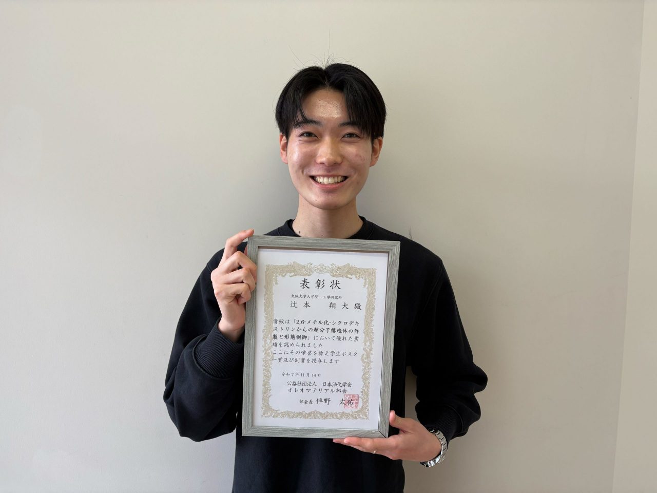 第7回オレオマテリアル学術交流会でM1の辻本翔大君がポスター賞を受賞しました。