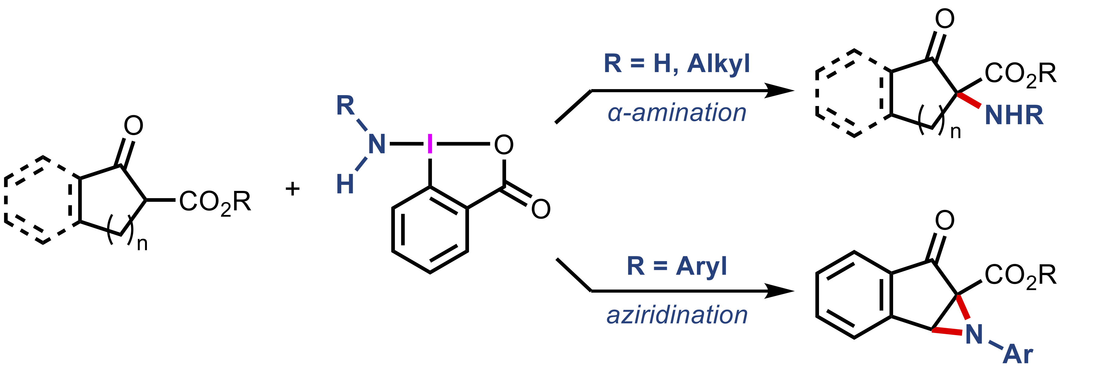 論文概要: 本研究では、様々な窒素官能基を有する超原子価ヨウ素化合物(アミノベンズヨードキソロン)を活用したβ-ケトエステルの酸化的アミノ化反応を開発した。NH2置換およびアルキルアミン由来のアミノベンズヨードキソロンを用いると求電子的α-アミノ化反応が進行し、一方、アリールアミン由来の反応剤を用いることで、縮環アジリジンが得られることを見出した。本手法により、様々なα-アミノ-β-ケトエステルを簡便に合成することが可能となり、それらは含窒素化合物合成における有用な中間体となる。